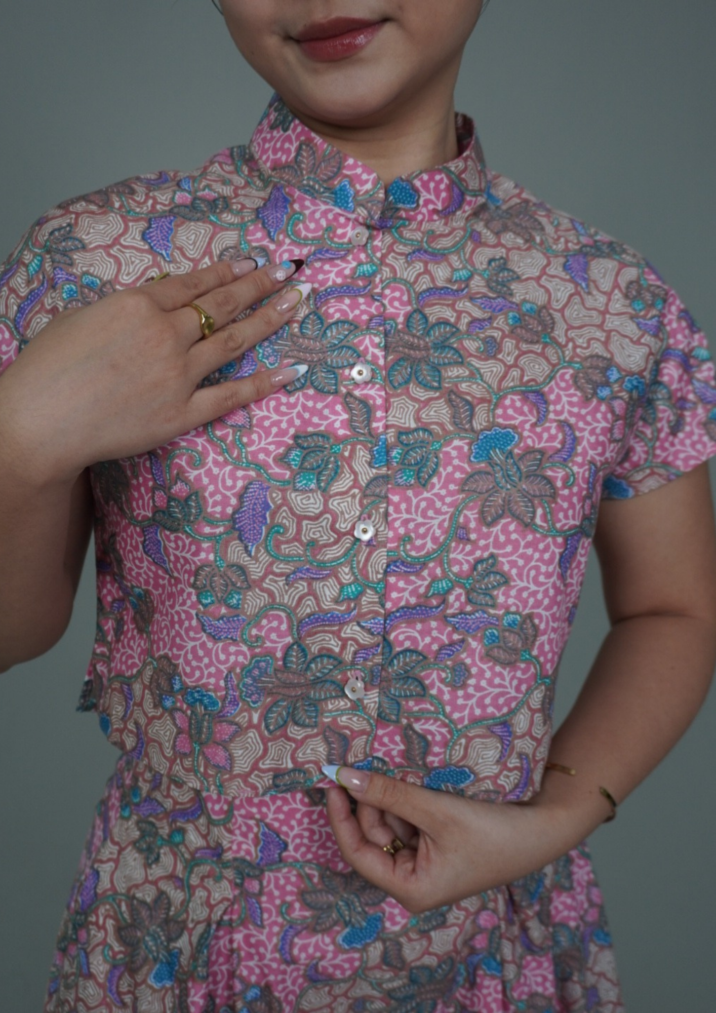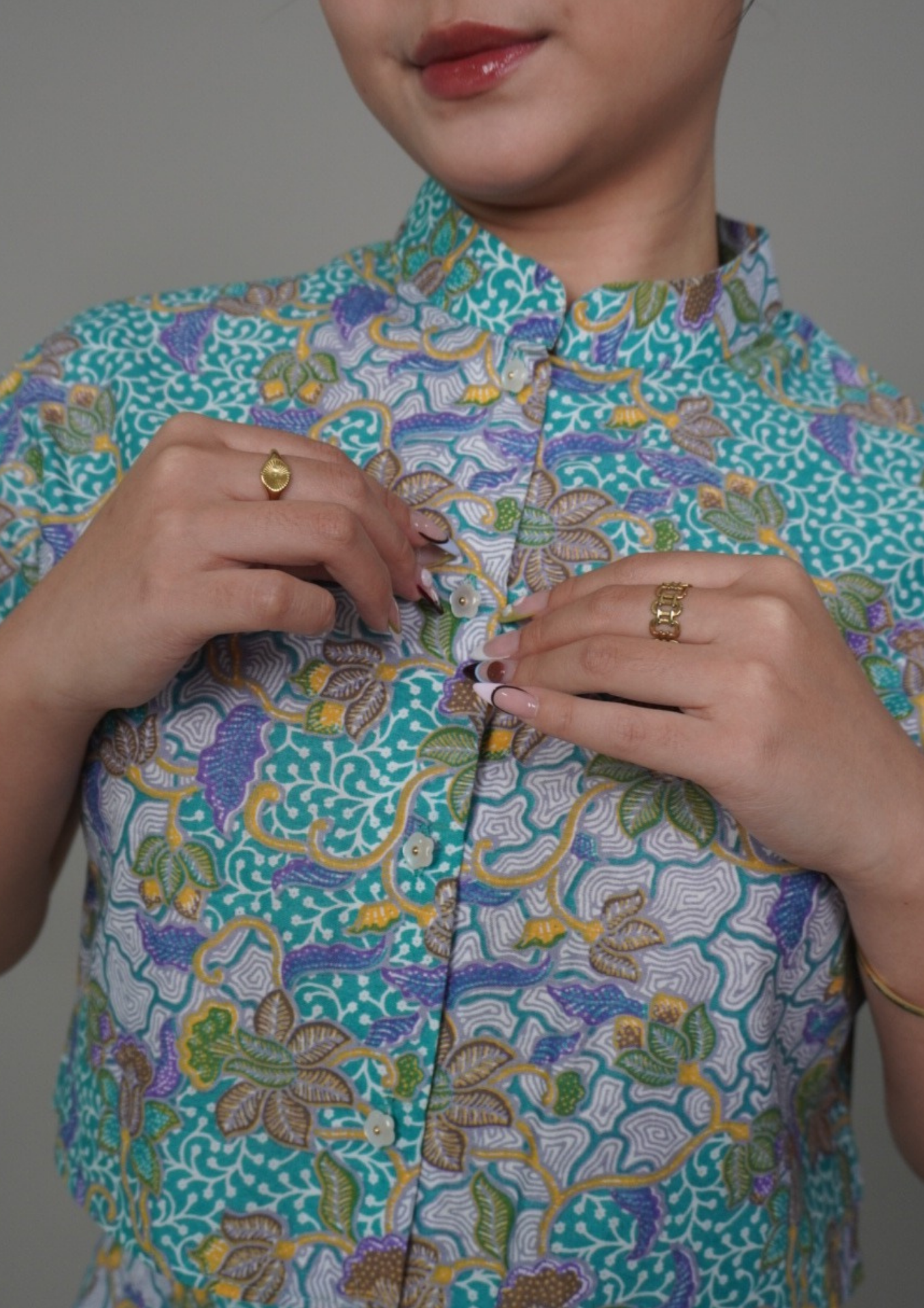 Relaxed, chic, and quietly refined. Designed for effortless everyday wear, the Mia Top features a cropped, relaxed silhouette with a classic mandarin collar for a timeless touch. Crafted from (fabric material), it’s finished with four jewel flower buttons that add a subtle hint of charm. Easy to style on its own or layered, this versatile piece moves seamlessly from casual days to elevated moments.