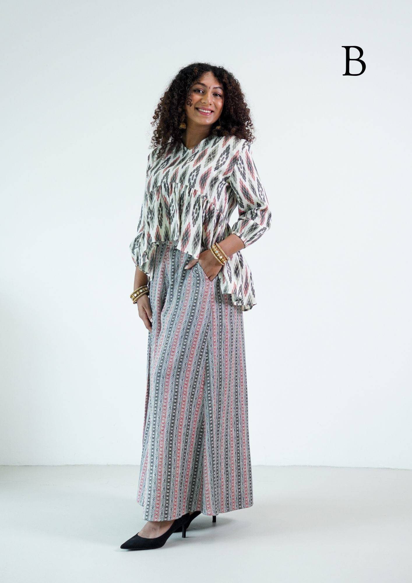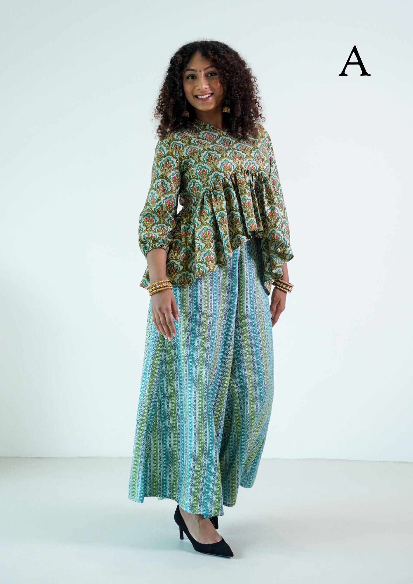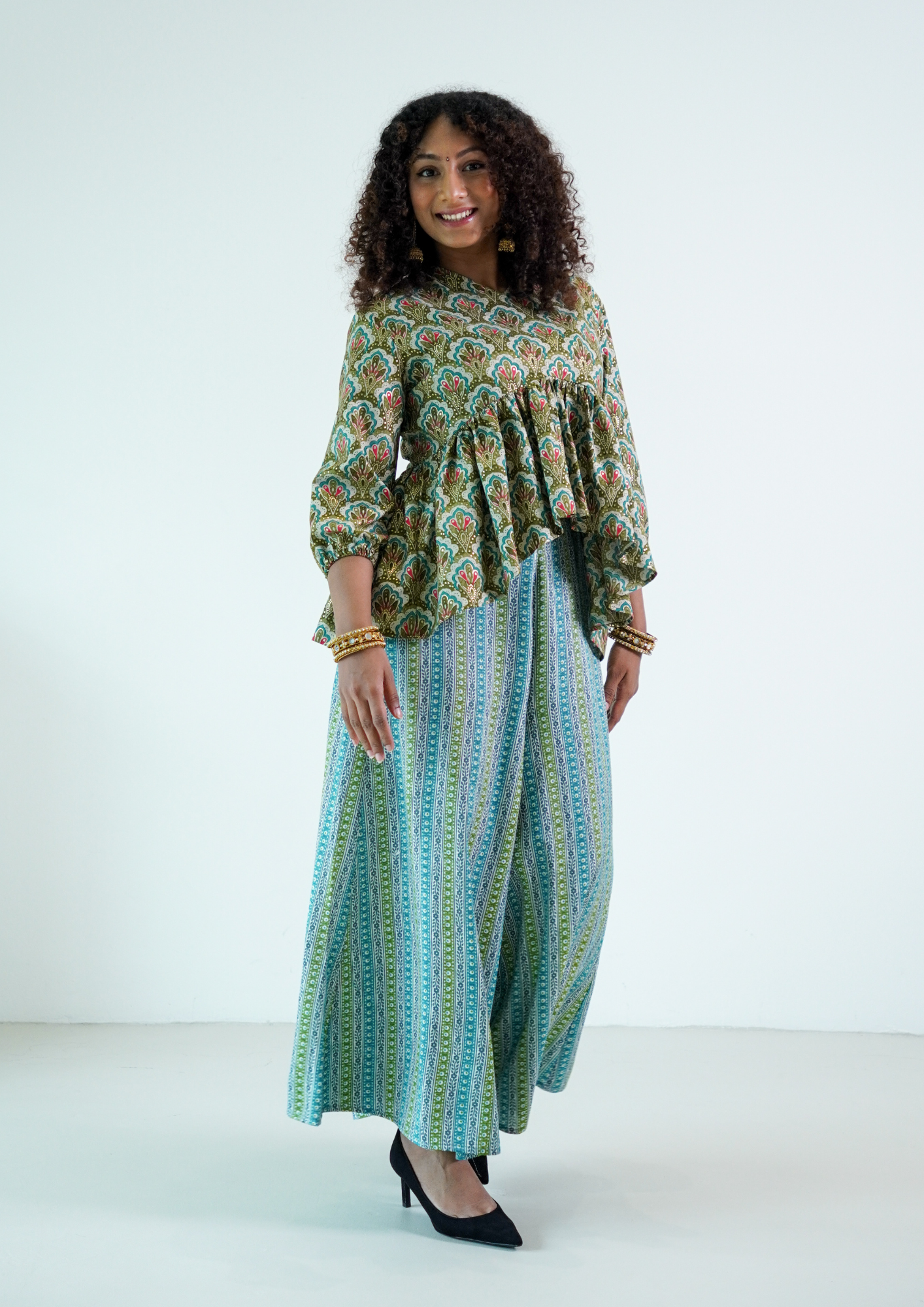 The Priya Set is designed for the woman who wants effortless elegance this Deepavali. Featuring the ruffled peplum Priya Top paired with the flowy wide-leg Jiwa Pants, this set strikes the perfect balance between festive charm and everyday comfort. The airy fabrics and flattering cuts allow you to move with ease, while the unique prints bring a touch of heritage-inspired style. Complete with pockets and thoughtful details, the Priya Set is your go-to ensemble for looking polished and feeling confident all day long.