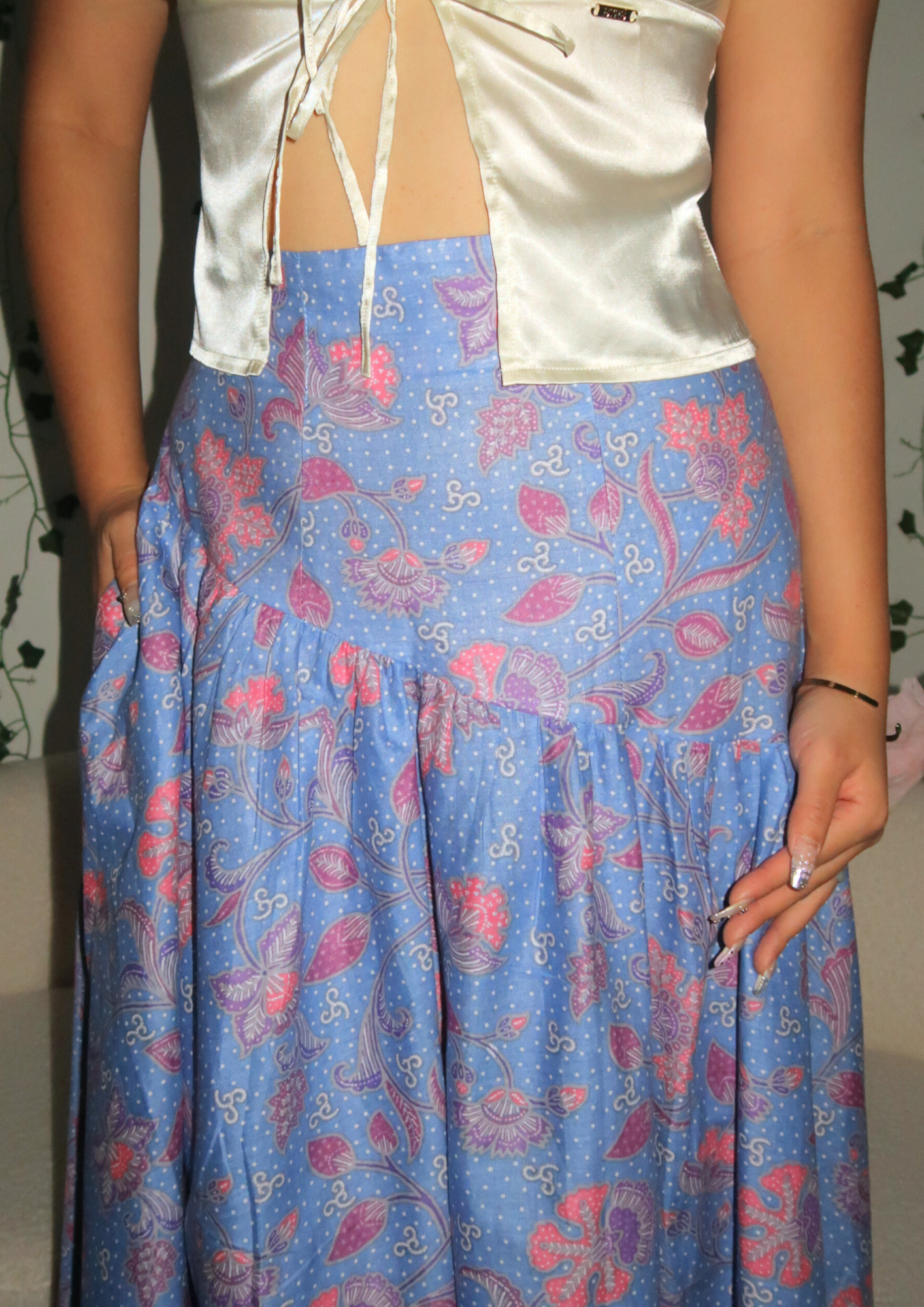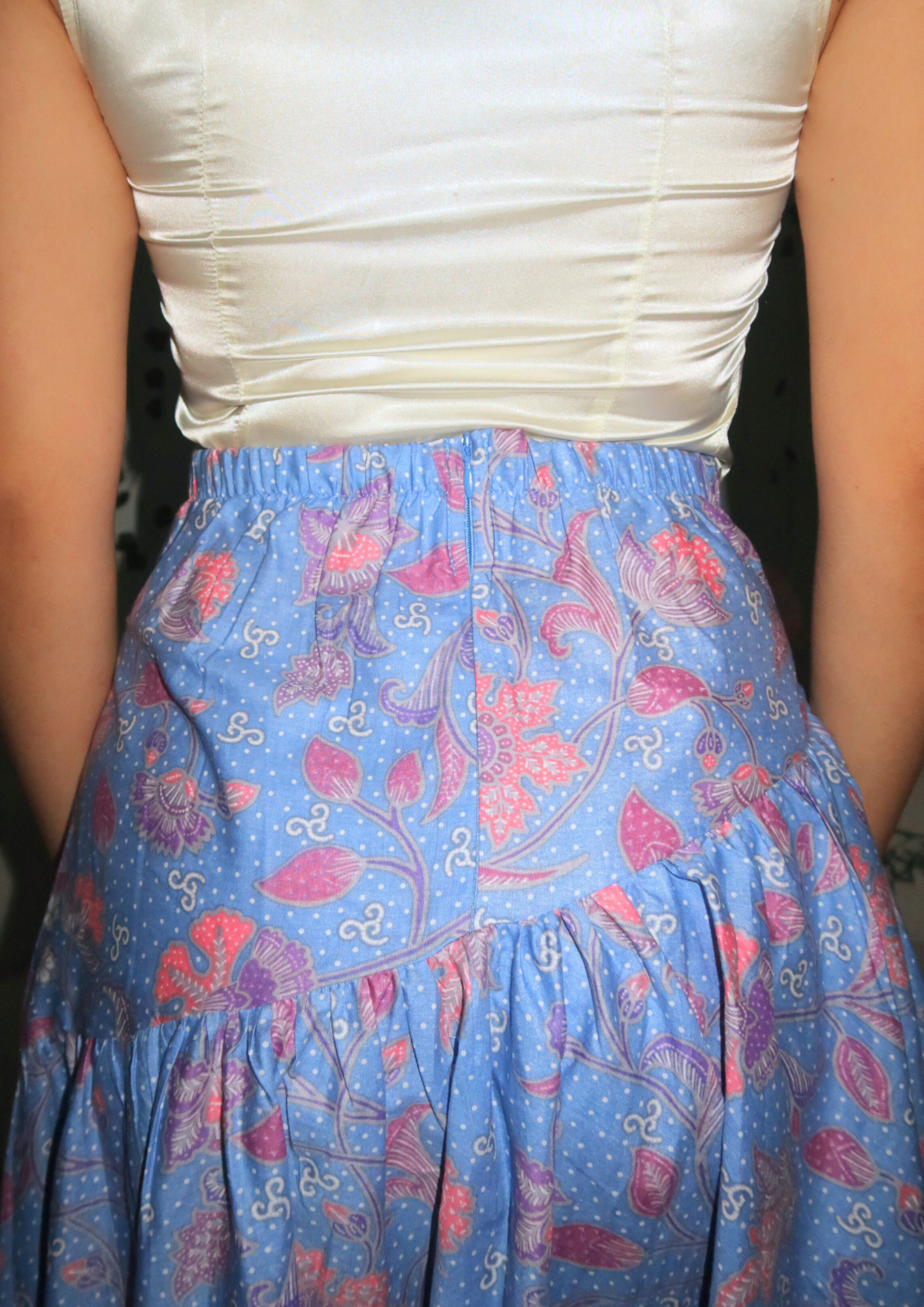 The Cindy Skirt brings a soft, romantic twist to your everyday style. Featuring an asymmetrical gathered seam that drapes beautifully from the hips, this flowy skirt adds subtle movement and charm to your look. Crafted in a pastel blue batik print with touches of pink florals, Cindy captures the essence of effortless femininity. Designed with practical side pockets, a hidden back zipper, and a stretchable waistband for comfort, it’s that perfect balance between pretty and practical.