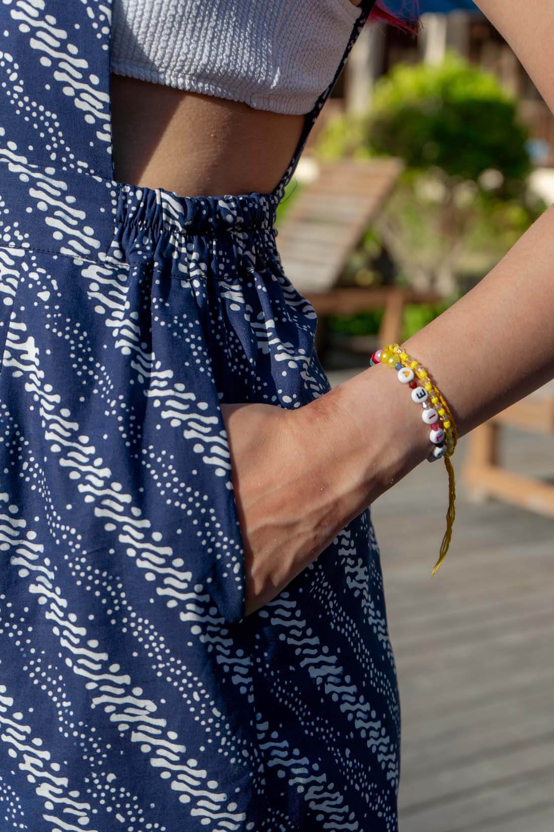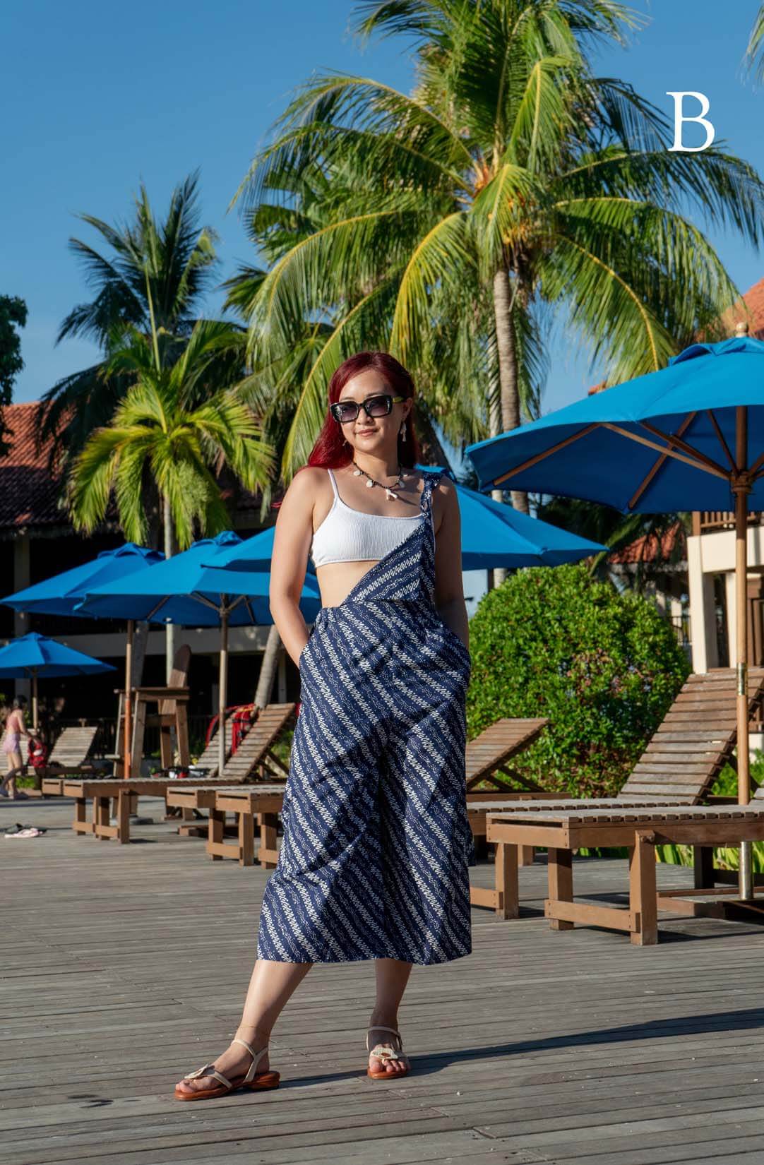 Introducing our debut jumpsuit, inspired by the iconic Donna from Mamma Mia. Effortlessly elegant, crafted from luxurious batik fabric in captivating dark blue and white hues. Perfect for day or night, it's destined to become a standout piece in your wardrobe. Plus, it features convenient pockets and side zippers for added functionality and style.