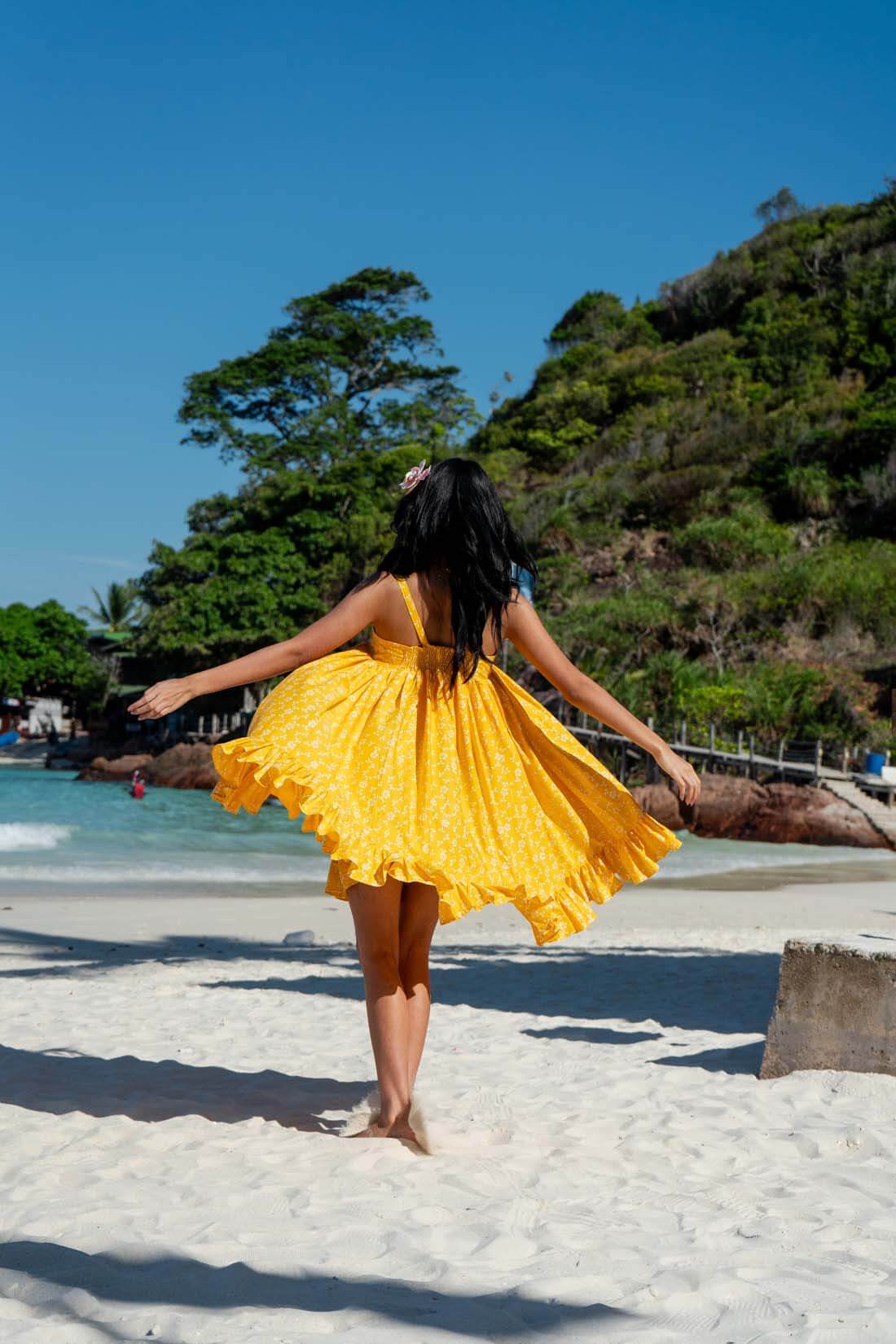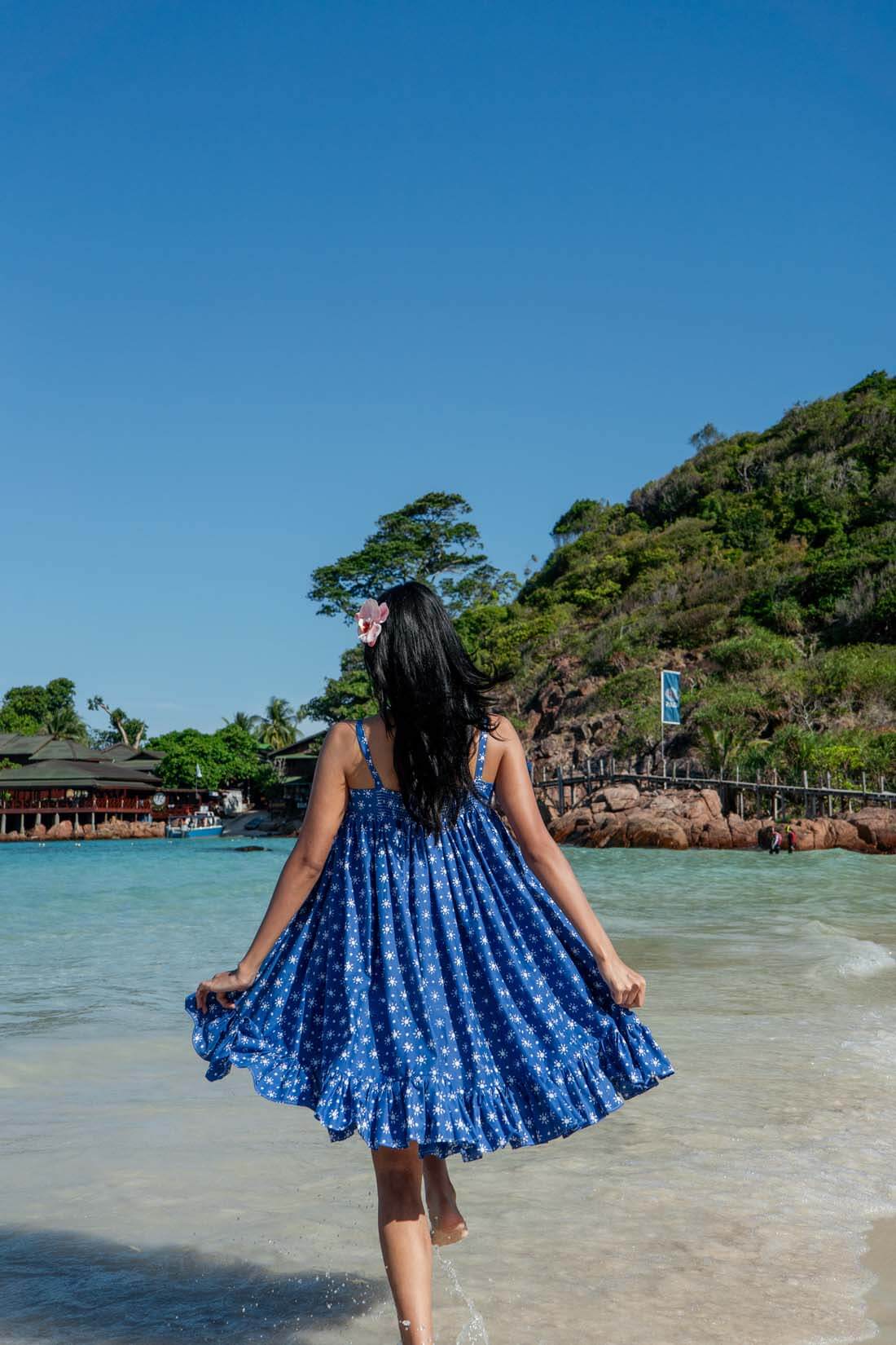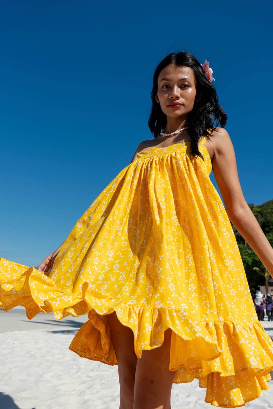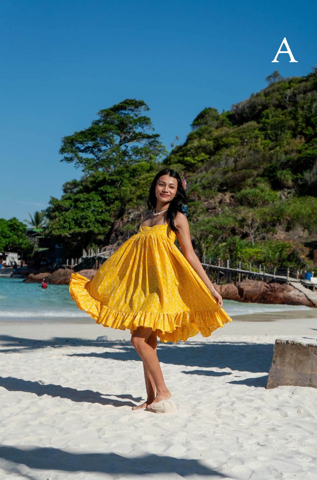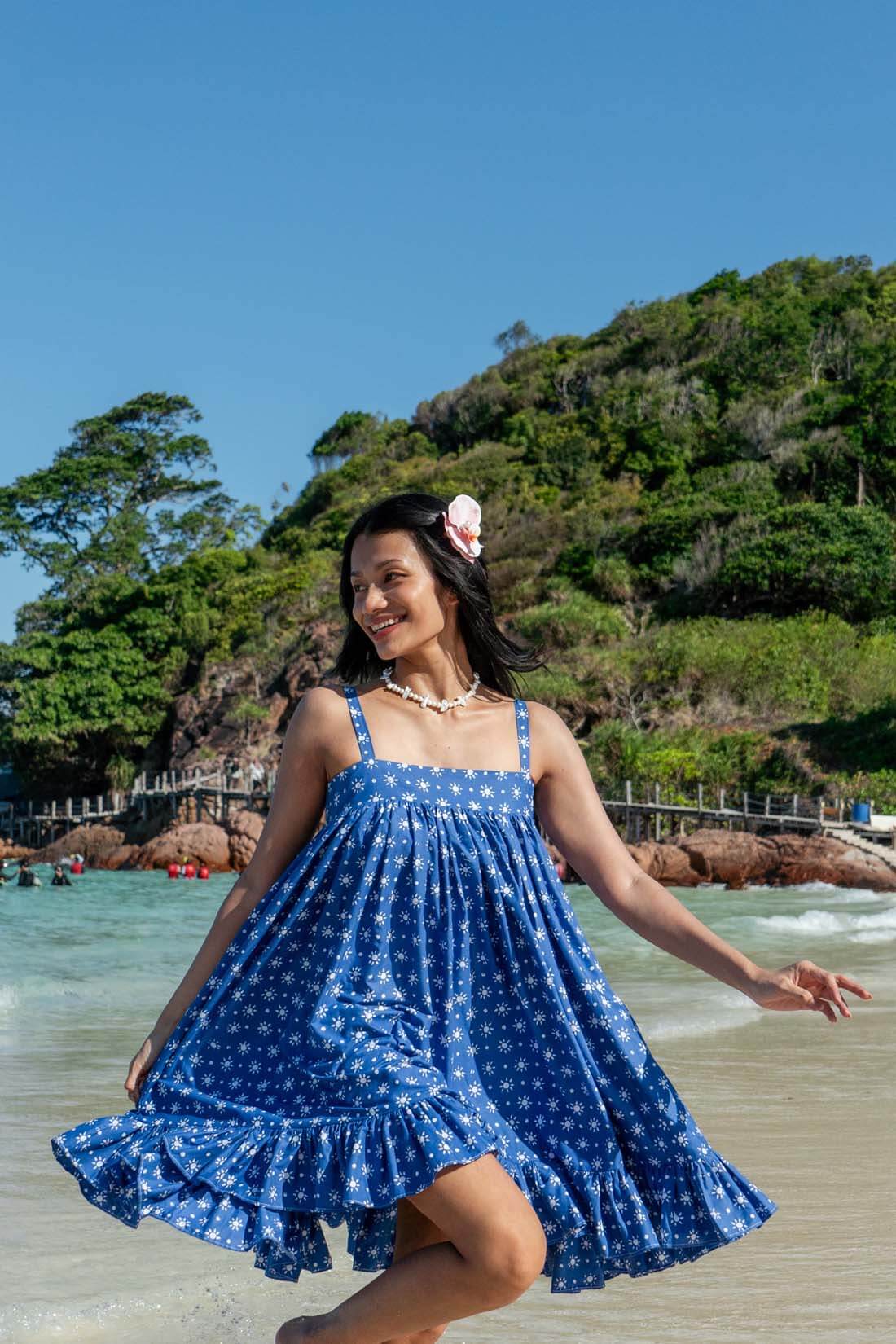 Introducing the Lana Dress, a whimsical resortwear piece inspired by the charm of a baby doll silhouette and named after our beloved cat, Lana. Crafted for comfort and style, its flowy, lightweight fabric is perfect for beach days. With shirring at the back for added comfort, it's your go-to choice for effortless elegance by the shore.